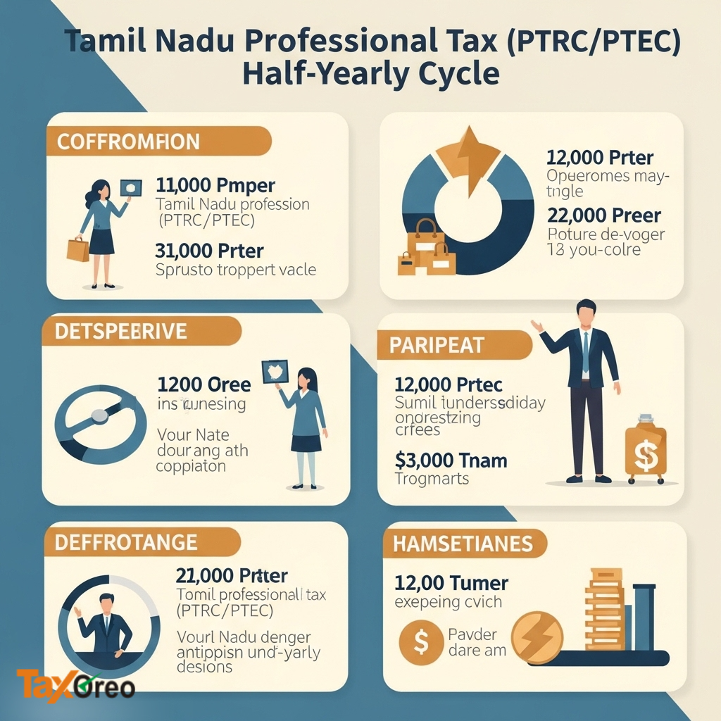 Tamil Nadu uses half-yearly cycles. Employers and self-employed pay PT in two instalments. Slabs vary by salary: ₹135 (₹21k-30k), ₹315 (₹30k-45k), ₹690 (₹45k-60k), ₹810 (>₹60k). Payment via TN Commercial Taxes portal.
